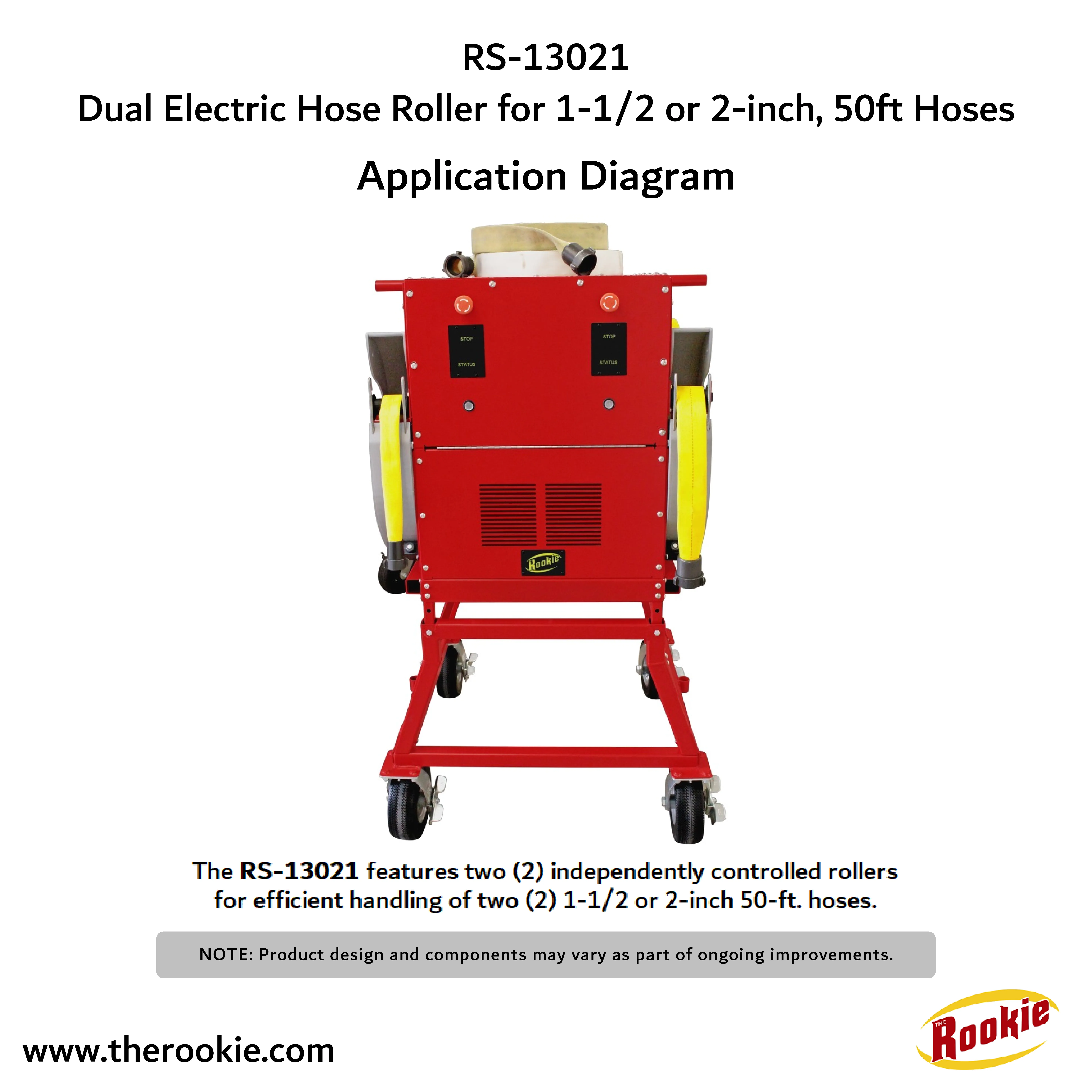 Built with two independently controlled rollers, the RS-13021 gives you the flexibility to roll two fire hoses ranging from 1-1/2 to 2 inches either simultaneously or separately.